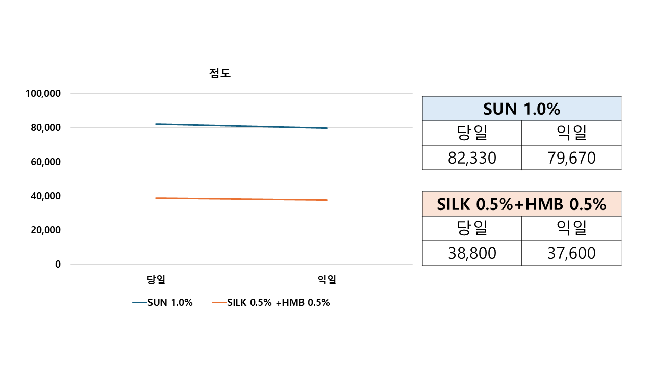 └ SUN 1%과 SILK 0.5% + HMB 0.5%의 점도 비교 (당일과 익일 기준)